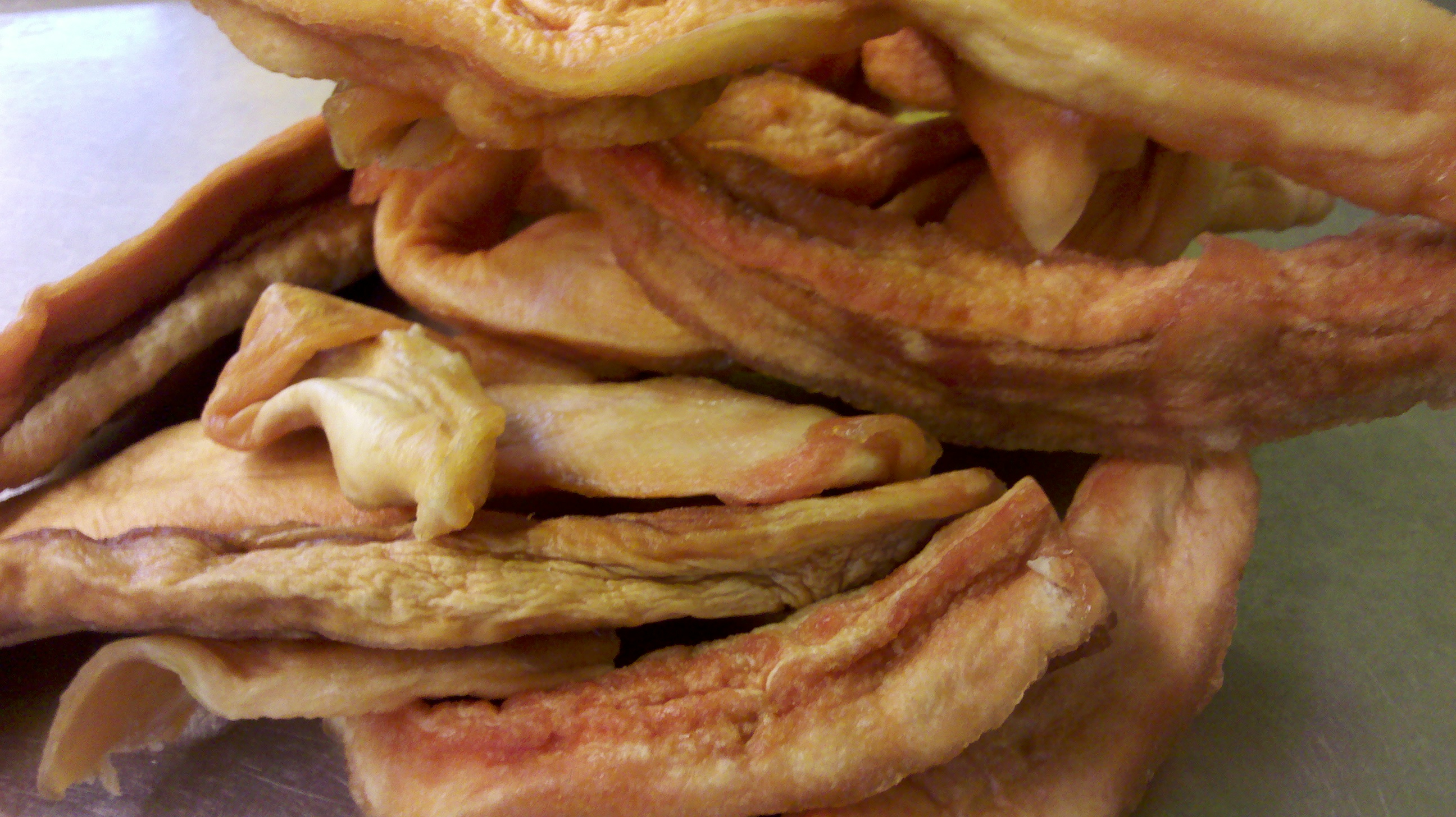 geschält, geschnitten, im eigenen Saft gekocht und getrocknet.